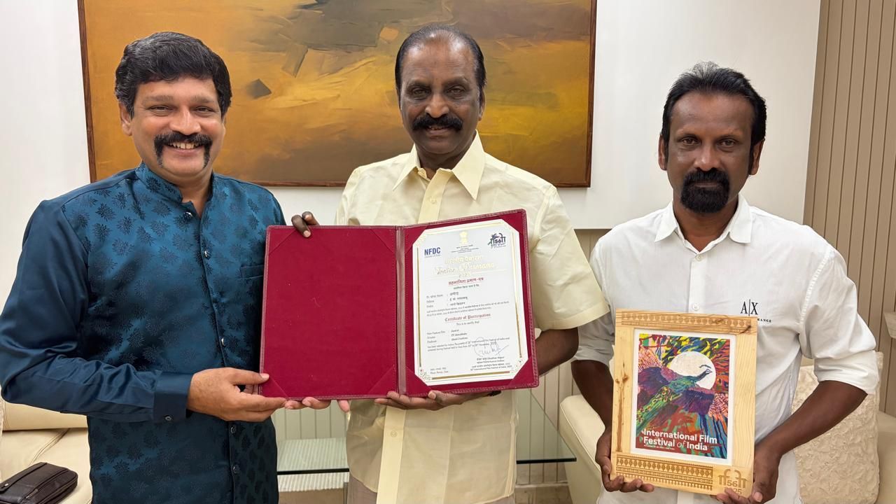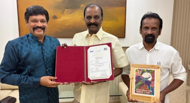 இயக்குநர் ஈ.வி. கணேஷ் பாபு இயக்கிய ‘ஆநிரை’ குறும்பம் கோவா இந்திய சர்வதேசத் திரைப்பட விழாவில் திரையீட்டுக்குத் தகுதி பெற்றதை ஒட்டி வழங்கப்பட்ட சான்றிதழுடன் தன்னைச் சந்தித்து வாழ்த்து பெற வந்த ஈவி கணேஷ் பாபுவை வாழ்த்தி விட்டு அவர் கூறியுள்ளதாவது,