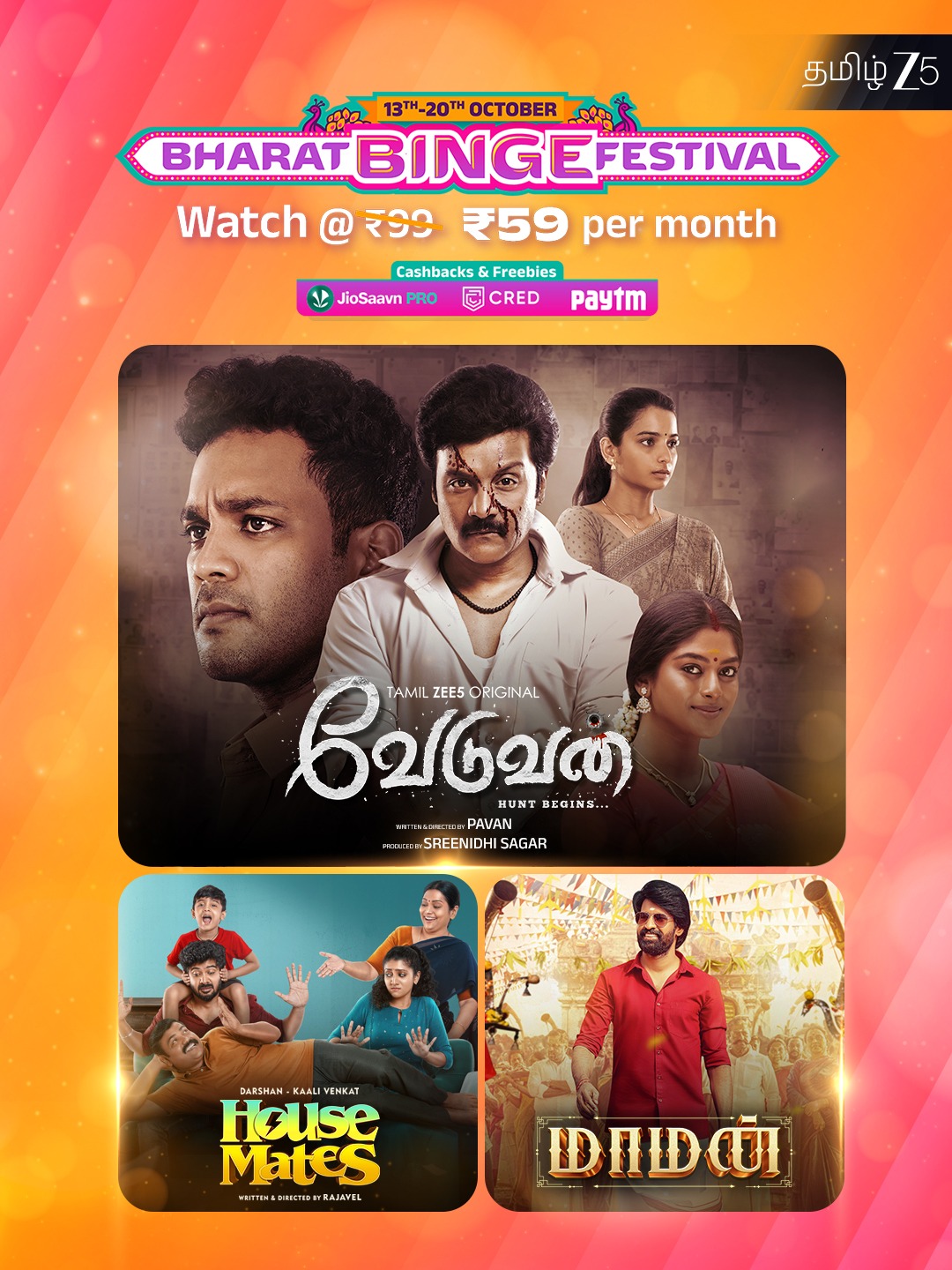 ZEE5, Paytm UPI AutoPay மற்றும் Cred UPI AutoPay போன்ற முன்னணி வாடிக்கையாளர் தளங்களுடன் இணைந்து உறுதியான cashback பெறும் சலுகைகள் வழங்குகிறது. மேலும், JioSaavn Pro யின் மூன்று மாத இலவச பரிசோதனை ZEE5 திட்டங்களுடன் வழங்கப்படுகிறது – இதன்மூலம் கதைகளையும் இசையையும் ஒரே நேரத்தில் அனுபவிக்கலாம்.